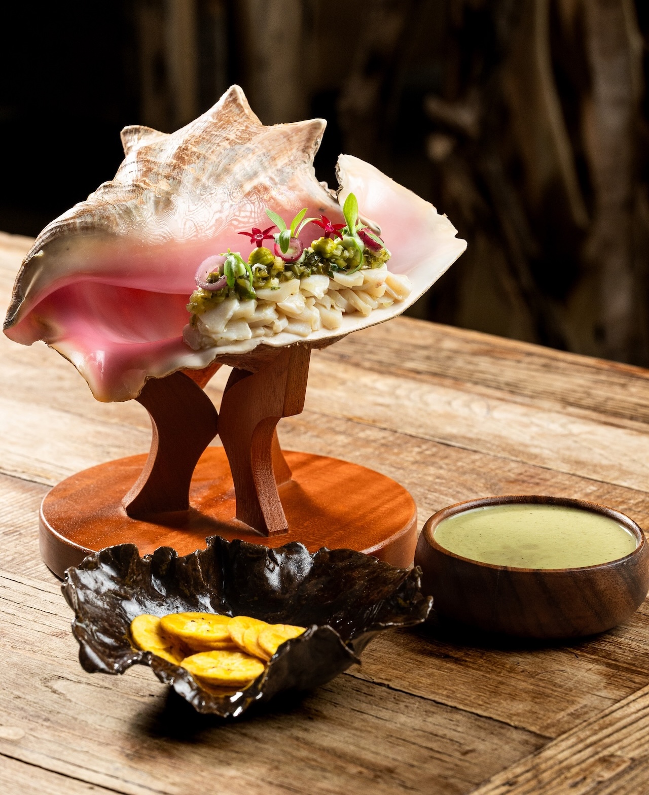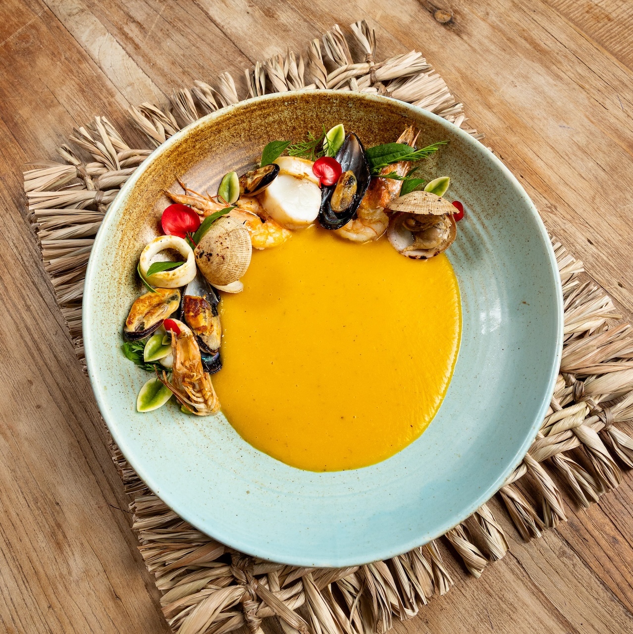 Bisque de coco · batata · cítricos del Caribe