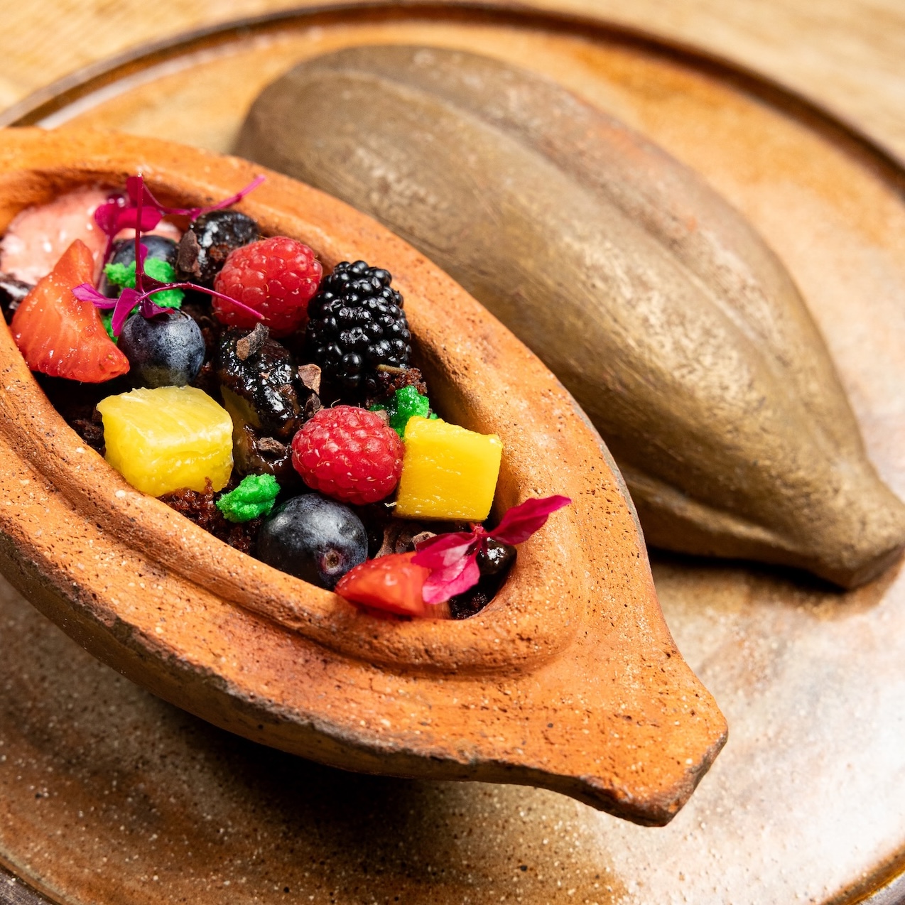 Mazorca de barro · berries · mousse de cacao